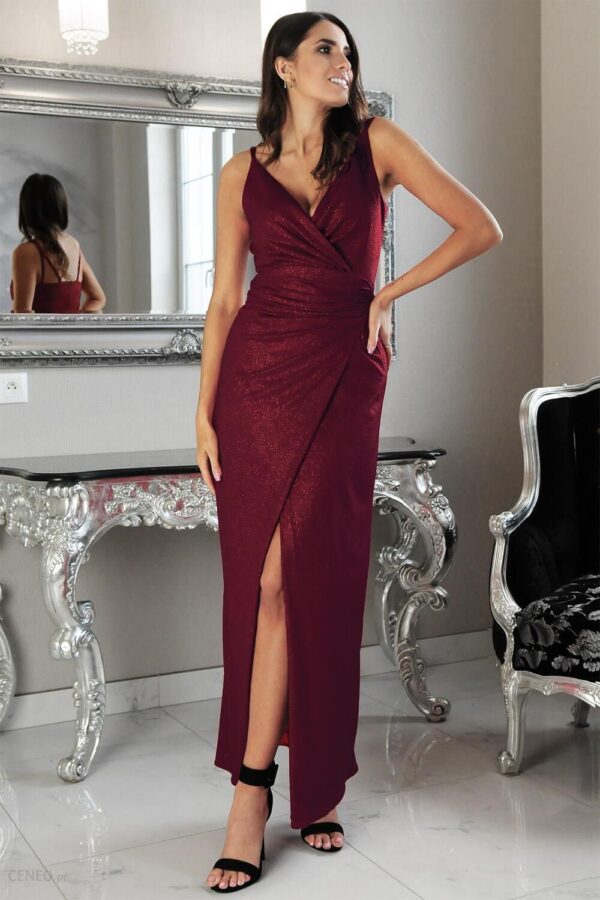 Kopertowa sukienka maxi z marszczeniami w pasie to zjawiskowy model w klasycznym stylu. Dopasowany fason świetnie podkreśla figurę, a marszczenia na wysokości talii oraz głębokie wycięcie na nogę jeszcze potęgują ten efekt. Kopertowy dekolt wieńczą podwójne ramiączka, które zmysłowo układają się na plecach. Sukienka zapinana jest na kryty zamek z tyłu, a całość prezentuje się efektownie i idealnie sprawdzi się na wielkie wyjścia. Dodatkowe informacje: długość maxi drapowanie na wysokości talii głęboki kopertowy dekolt podwójne ramiączka z tyłu głębokie rozcięcie na nogę błyszcząca tkanina zapięcie na kryty zamek z tyłu