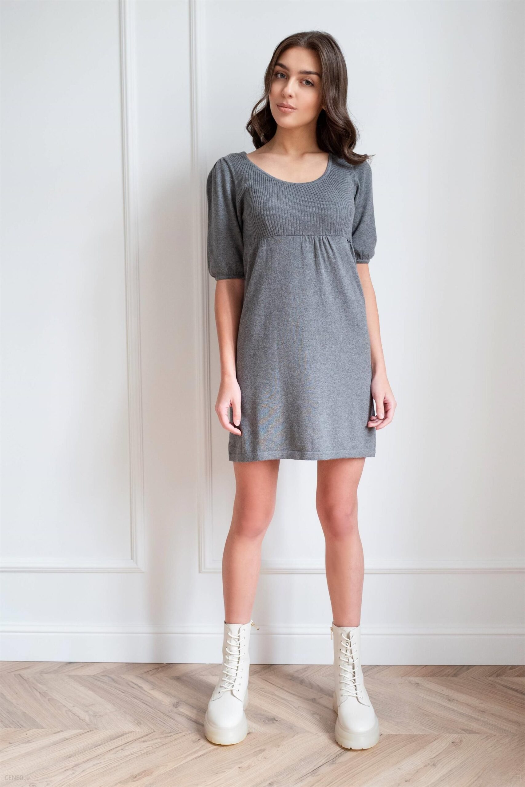Dzianinowa sukienka mini z okrągłym dekoltem to urocza i wygodna propozycja na co dzień. Krótkie, lekko bufiaste rękawki dodają temu modelowi subtelnego wdzięku, a prążkowana góra łączy się z gładkim dołem nad linią talii. Przyjemna w dotyku dzianina otuli Twoją sylwetkę, a uniwersalny fason z łatwością wystylizujesz na różne sposoby. Materiał: 50% bawełna, 25% wiskoza, 25% poliamid Dodatkowe informacje: długość mini wysoki stan lekko bufiaste rękawki prążkowana góra okrągły dekolt krótkie rękawy zakończone plisą dół lekko rozszerzany, gładki przyjemna w dotyku dzianina Wymiary: