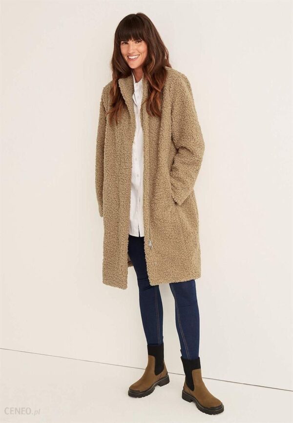 Płaszcz z tkaniny pluszowej ze stójką. Prosty fason z kieszeniami po bokach. Zamek z krytą listwą guzikową. Długość od ramion wzależności od rozmiaru ok. 100-108 cm. • Podszyty